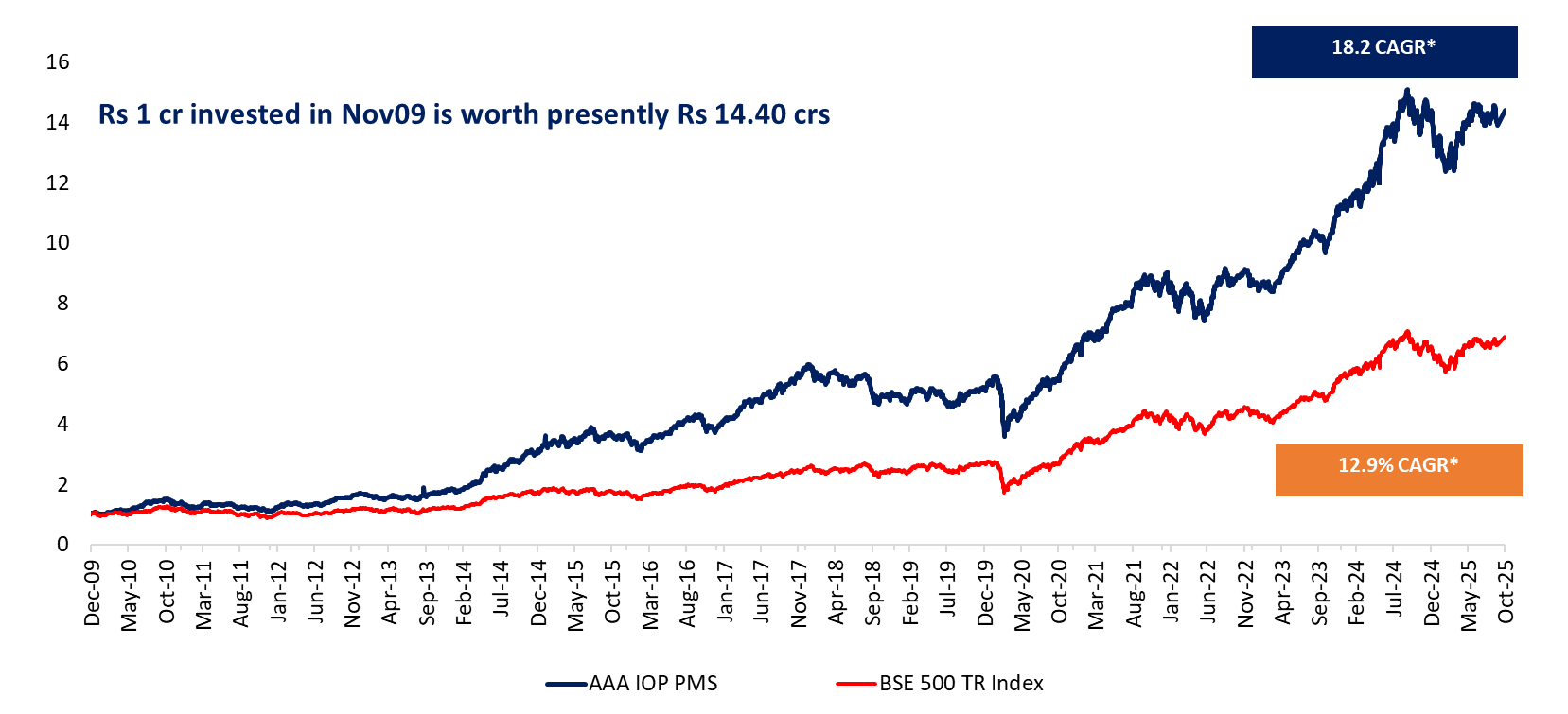 Disclaimer: *(23 Nov 2009-31 Oct 2025) Performance figures are net of all expenses and fees till last quarter. Index performance is calculated as per Total Return Indices in accordance with the SEBI Guidelines. Returns of individual clients may differ depending on time of entry in the Strategy. Past performance may or may not be sustained in future and should not be used as a basis for comparison with other investments. Performance related information provided herein is not verified by SEBI. For Performance relative to other Portfolio Managers within the selected Strategy, please visit: bit.ly/APMI_PMS