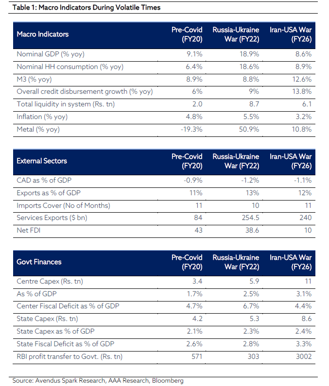 However, context matters enormously. Our base case, consistent with the assessment of most credible forecasters, is that this disruption is measured in weeks rather than quarters. A temporary oil shock is fundamentally different from a structural one. Unlike earlier stress episodes, India is entering this phase with significantly stronger macro shock absorbers (Refer to Table 1). Growth remains resilient, supported by healthy money supply expansion and robust credit growth. Inflation is materially lower, providing room for policy flexibility. External balances remain stable, with comfortable forex import cover, while services exports continue to provide a steady cushion.