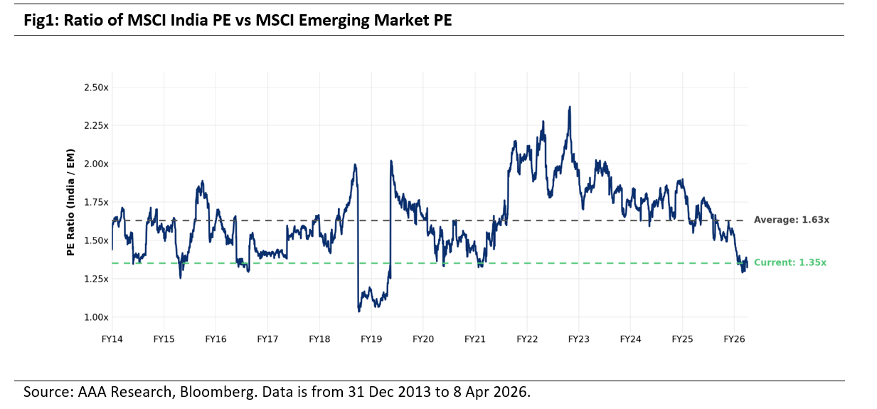 The valuation premium of MSCI India versus MSCI Emerging Markets has corrected meaningfully over the past year. P/E multiples is now approaching multi year support zones, levels that have historically marked important inflection points for India’s relative outperformance (Refer to Fig1).