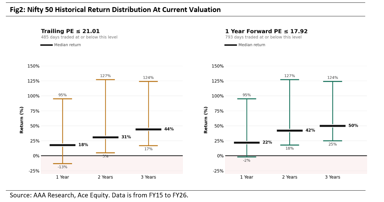 Over the last 11 years, the NIFTY 50 traded at or below 21x trailing P/E on 485 trading days. Historically, investing at these valuation levels has resulted in positive returns 90% of the time over the subsequent 1 year, and 100% of the time over 2 to 3 year holding periods. Even in less favorable outcomes, downside has been relatively contained, with the worst 1 year return at -13%, while median returns were 18% for 1 year, 31% for 2 years, and 44% for 3 years, indicating an attractive risk reward profile from comparable valuation entry points (Refer to Fig 2).
