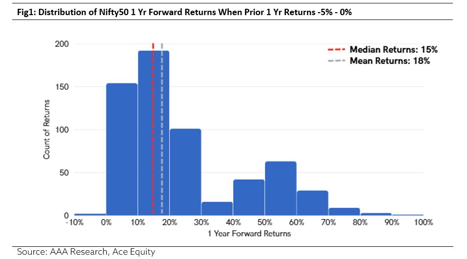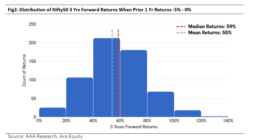 Extending the horizon to three years further strengthens the case for staying invested. Historically, one-year declines of around 3.45% have been followed by median three-year forward returns of 59% and average returns of 55%, with 100% of such periods turning positive over the next three years (Refer to Fig2).