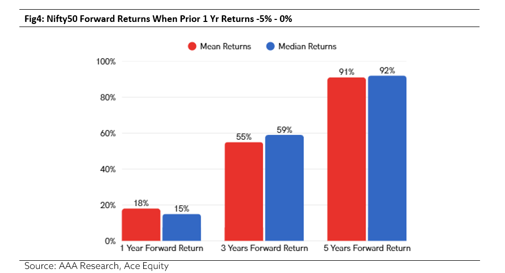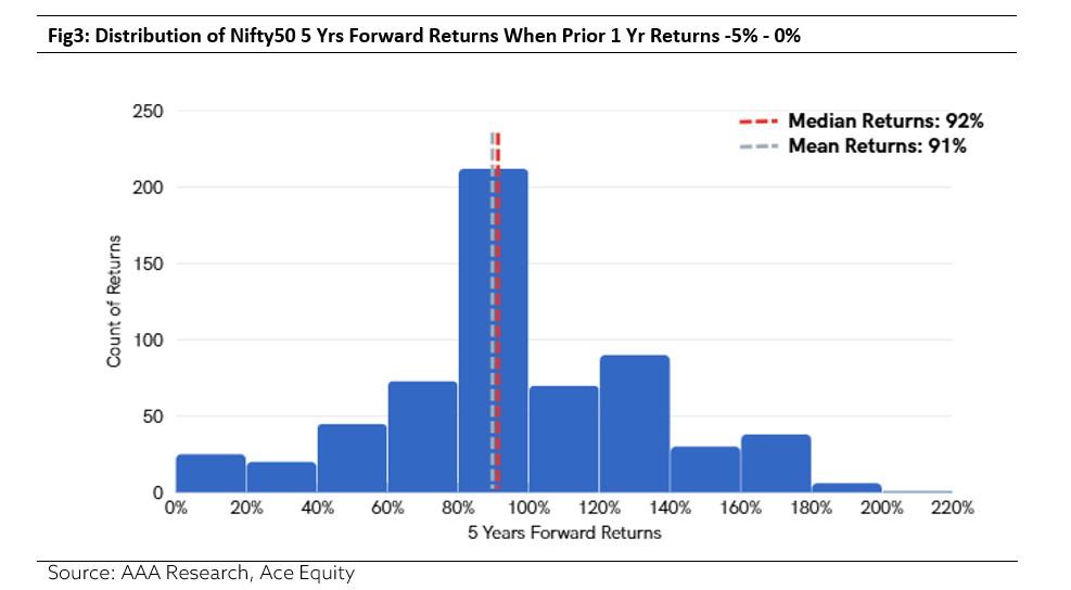 The story becomes even more compelling over a five-year horizon. Historically, one-year declines of around 3.45% have been followed by strong five-year recoveries, with median forward returns of 92% and average returns of 91% (Refer to Fig3). Moreover, all such periods have gone on to deliver positive five-year returns, reflecting a 100% success rate.